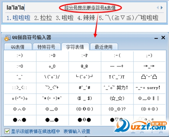 3)想要其他特殊符號(hào),也可以先打一個(gè)啦啦啦,然后在拼音上面會(huì)有一個(gè)“按分號(hào)顯示更多符號(hào)&表情”,點(diǎn)擊就能看到很多特殊符號(hào)和表情。
