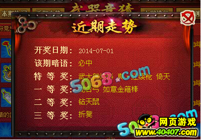 一等獎、二等獎、三等獎應(yīng)該選擇與暗語意思相近、相似,比如“忽略、必中、不被反擊”都有100%的意思;“帶毒、連擊”都有幾率小于100%的意思。必中也有“準必中”的意思,“忽略×××”只看“忽略”二字即可,“不被反擊”只看“反擊”二字即可。對于“來自東海龍宮”,我們可以想:東海龍宮的背景顏色以藍色、紫色為主,我們可以選擇含有這些顏色的武器,如紫金八卦錘、斗神劍、龍舌弓、軒轅劍、流 星 趕月、斗神劍、倚天劍,等等。
