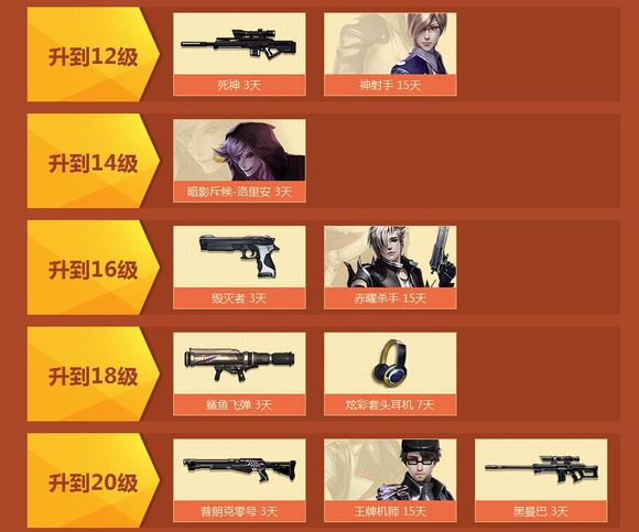 活動(dòng)期間的升級(jí)也能獲得一系列的獎(jiǎng)勵(lì),但是只是新手哦,每隔兩級(jí)都有獎(jiǎng)勵(lì)可拿,上面的活動(dòng)還贈(zèng)送了“經(jīng)驗(yàn)加成卡”,更有利于玩家的升級(jí),是不是很好呢,那還等什么,看著這些皮膚和武器,相信你們都動(dòng)心了吧,那就快上線體驗(yàn)并且升級(jí)拿獎(jiǎng)勵(lì)吧~。