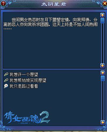 2.男性玩家可去太陰星君處查看愿望(需當(dāng)天在線滿30分鐘),若是已婚,會獲得娘子的愿望;若是未婚,則由系統(tǒng)隨機給予一名女性玩家的愿望。