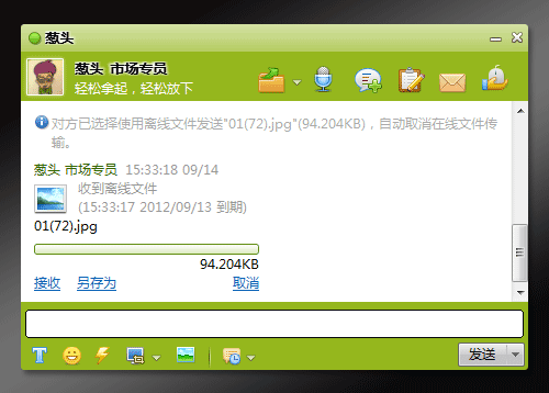 用戶也可以按照在線發(fā)送文件的操作方式發(fā)送文件,點擊“發(fā)送離線文件”,開始將次文件進行離線形式傳送。 如下圖所示。