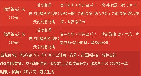 4、在賬號下首次創(chuàng)建角色后的1天內(nèi)充值兌換,即可獲得豪華首充禮包,3天內(nèi)充值兌換即可獲得精致首充禮包,3天后充值兌換即可獲得普通首充禮包。