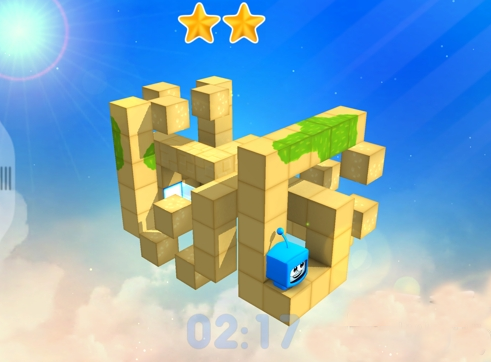 2、站在第二個上下移動的方塊上,當(dāng)方塊在下面的時候,快速向左下方旋轉(zhuǎn)兩次,這樣我們會掉落到上面的那個星星的界面,注意一定要快速旋轉(zhuǎn),而且要當(dāng)這個方塊在兩個方塊的下面的時候,不然會直接掉下去的,大家掌握好時機。
