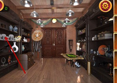 1、本關(guān)一開始要把注意力集中在房間右邊的架子上,點擊架子,在架子上有一只大象,先收起來。