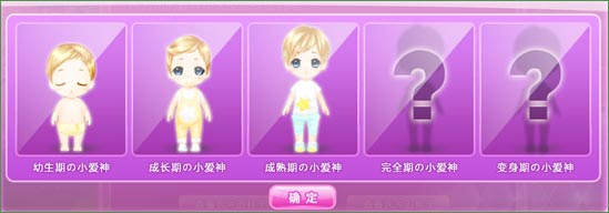 愛神小天使擁有成長屬性,表現(xiàn)為5個(gè)階段:幼生期,成長期,成熟期,完全期,變身期。每個(gè)階段下?lián)碛?個(gè)級別,如幼生