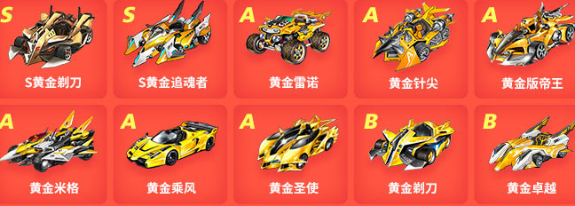 s黃金剃刀、s黃金追魂者、a黃金雷諾、a黃金針尖、a黃金版帝王、a黃金米格、a黃金乘風(fēng)、a黃金圣使、b黃金剃刀、b黃金卓越其中的賽車之一。