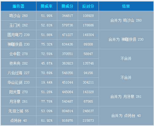 除云中歌、夜未央、八仙過(guò)海和華山論劍以外,鳴沙山、玉門(mén)關(guān)、圓月彎刀、神雕俠侶、陽(yáng)關(guān)雪、月牙泉、無(wú)淚之城、點(diǎn)將臺(tái)服務(wù)器贊成分?jǐn)?shù)均大于投票總分的50%,因此將于9月18日進(jìn)行服務(wù)器合并。服務(wù)器合并后,原登錄界面上的服務(wù)器名稱都將保留一段時(shí)間,大家可以繼續(xù)按以往的方式進(jìn)入游戲。