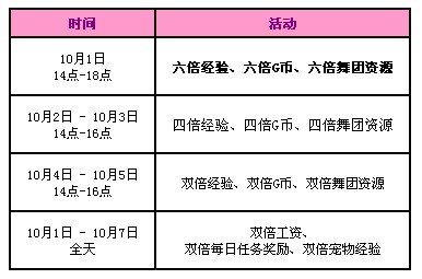 10月1日14-18點期間,我們?yōu)榇蠹覝蕚淞肆督?jīng)驗、六倍G幣、六倍舞團資源活動!其他活動期間我們也同樣為大家準備了四倍、雙倍活動!