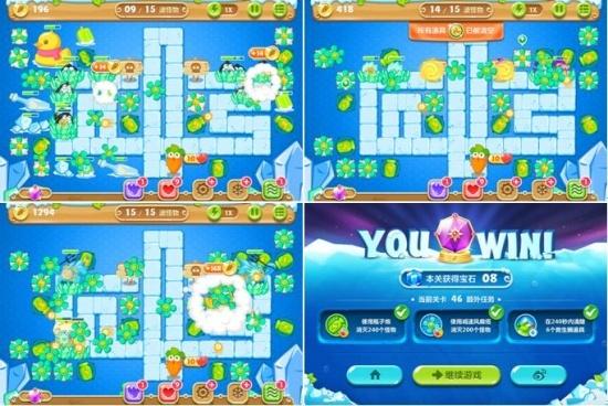 游戲開始后首先考慮完成第二個和第三個額外任務(wù),可以在右下角安裝太陽花塔選擇清除周邊道具的同時,兼顧消滅怪物,找出隱藏炮塔,如瓶子炮、冰錘塔等。繼續(xù)在右側(cè)空白位置安裝太陽花塔,選擇清除右側(cè)紅色大冰棍道具。后續(xù)在消滅怪物的同時,利用中間的瓶子炮繼續(xù)選擇清除綠色冰棍,并逐漸清除左側(cè)救生圈道具,獲得便便塔。這時,玩家可以拆除便便塔安裝太陽花、火箭等攻擊性較強的炮塔,提升清除道具的能力,有利于利用盡早完成后二個額外任務(wù)。