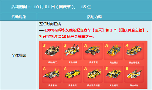 十一黃金國慶節(jié),全名大狂歡,qq飛車為大家準備了國慶節(jié)狂歡活動,活動期間,永久絕版紀念賽車破天、國慶黃金寶箱等著大家來領,還有14888點券,是不是很心動呢?下面小編就給大家詳細介紹活動qq飛車10月1-10月7日活動吧。