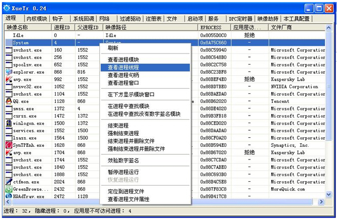 下面進(jìn)入正題,第一步,跑跑(不要登陸,如果在登錄界面會提示發(fā)現(xiàn)黑客工具就請登錄游戲到小屋后再打開過非法軟件進(jìn)行過非法)和打開工具”過非法軟件”,在“過非法軟件”中找到system進(jìn)程,右鍵點(diǎn)擊system,選擇“查看進(jìn)程線程”。
