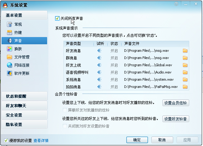 在基本設(shè)置里面,我們選擇聲音,這里就是我們修改QQ消息提示音的地方了
