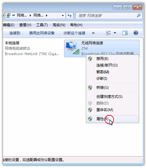 右鍵點擊在你正在使用的網絡連接圖標,比如:「無線網絡連接」,圖標上再點擊「屬性」。 (如您在連接的網絡是“本地連接”而不是“無線網絡”,那請修改“本地連接”)