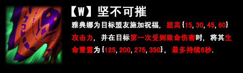 【W(wǎng)】堅(jiān)不可摧:這個(gè)技能前期可能略顯雞肋。雖然可以為隊(duì)友增加攻擊力,但是生命重置效果需要目標(biāo)受到致命傷害時(shí)才能觸發(fā)效果,而且CD還真的很長(zhǎng)接近一分鐘。前幾級(jí)無(wú)須太快點(diǎn)出,后期提前給隊(duì)友或者自己掛上,防止被秒殺保命卻是一流神技。