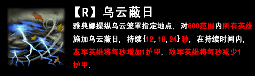【R】烏云蔽日:從E/R技能看來(lái)雅典娜很喜歡打扎堆的團(tuán)戰(zhàn),R技能和E技能一樣隊(duì)友站位越密集效果越好。雖然大招沒(méi)有傷害但是在范圍內(nèi)的友軍英雄能每秒增加護(hù)甲,敵軍則反之減少護(hù)甲。技能最多能持續(xù)24秒,換言之在圈內(nèi)友軍英雄和敵軍英雄的護(hù)甲都會(huì)最多增加或減少24點(diǎn)。這個(gè)大招有一個(gè)小亮點(diǎn),就是可以出“大師之杖”這件裝備去強(qiáng)化它。強(qiáng)化后技能范圍從600提升至800,持續(xù)時(shí)間從24提升至30。這個(gè)強(qiáng)化后的小飛躍還是很給力的。