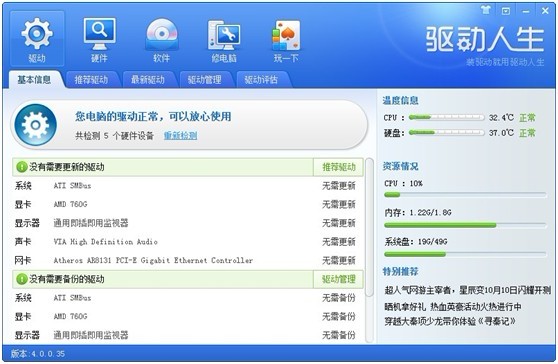 一鍵處理完成之后軟件會彈窗提示“一鍵處理完畢”,這時我們點擊重新檢測之后,軟件將會顯示驅動正常,并在下方將電腦的配置簡單顯示出來。除此之外,在軟件主界面?zhèn)冗厵谶添加了溫度信息與資源情況,用戶只要打開驅動人生2012,就可以對電腦的情況一目了然了。(如圖二)