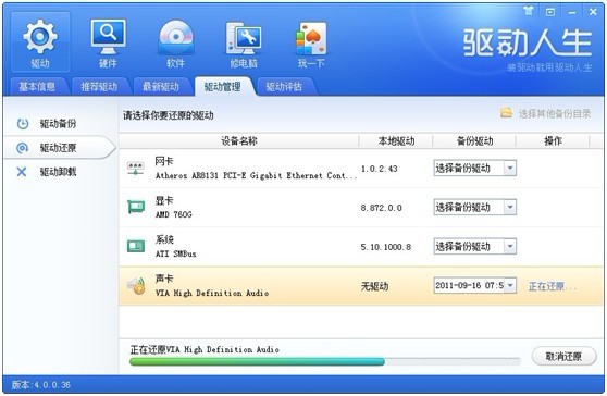 而在驅動還原中,我們可以通過備份驅動一欄的下拉菜單選擇不同的備份文件,選擇好之后點擊開始還原,設備的驅動就可以還原到備份時的狀態(tài)了。(如圖七)