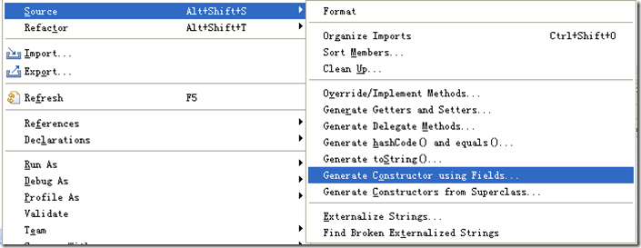 在類(lèi)代碼的空白處點(diǎn)右鍵,或者在類(lèi)名上點(diǎn)右鍵 —> Source –> Generate Constructor using Fields,如下圖: