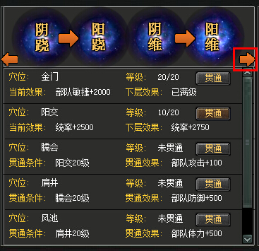 君主100級可開啟新手部奇脈“太陰”,(位于陰陽奇脈之后)升級此穴位可提升武將攻擊,防御,敏捷,體力,統(tǒng)率等屬性,使用道具“瓊漿”可以獲得氣運(yùn)值,提升君主奇脈穴位“太陰”。“瓊漿”可使用周王幣兌換,或者在商城中購買。