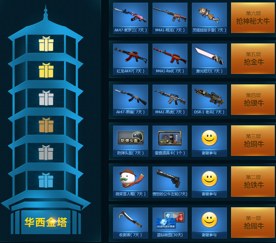 您可以支付15QB開啟華西村專屬禮包,領取鞭炮手雷7天+萬能樓層抽獎券1張(可用于抽任意樓層)+極品武器(必得其一中四選一)!30天黃金AK47等著你!