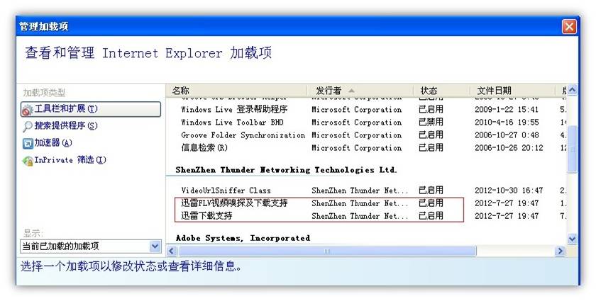 3、如果管理加載項(xiàng)內(nèi)并沒有迅雷下載支持的控件請(qǐng)重新下載迅雷并先卸載再重新安裝,不要覆蓋安裝。