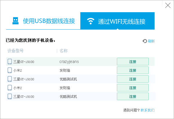 點擊客戶端首頁“連接手機”按鈕,開始進行連接,您可以選擇USB連接、WI-FI連接兩種連接方式,USB連接就是通過數(shù)據(jù)線連接,wif連接通過無線網(wǎng)絡進行連接,首先我們來看一下USB連接: