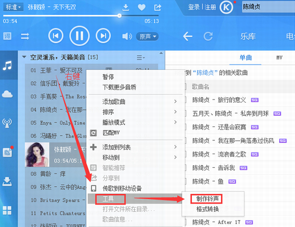 1、打開酷狗,選擇你的音樂,選中你要編輯的音樂,然后右鍵,下來菜單,點(diǎn)擊工具——》制作鈴聲,