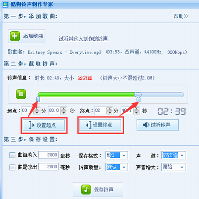 2、進(jìn)入鈴聲制作頁(yè)面,就可以發(fā)揮你的所長(zhǎng)了,跟很多的音樂編輯工具差不多。最重要的設(shè)置開始和結(jié)束時(shí)間,可以鼠標(biāo)點(diǎn)擊,也可以設(shè)定時(shí)間。同時(shí)還有其他很多設(shè)置,我就不一一介紹,你可以去自己嘗試就可以了。同時(shí),還可以試聽。如圖。