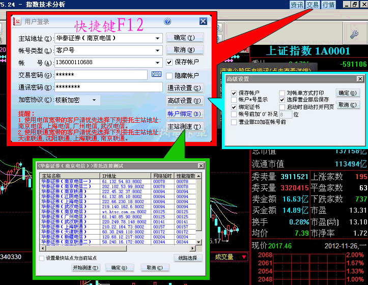 安裝軟件,按F12調(diào)出交易系統(tǒng) ,通過(guò)主站測(cè)速選擇最快的交易服務(wù)器