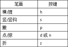 為筆畫提示區(qū),上方是常見筆畫:「一 丨 丿 丶 乛」,右下方為各筆畫拼音的首字母。 您可以在此區(qū)域用鼠標點擊輸入筆畫,也可以通過鍵盤敲入hspnz等輸入筆畫。具體筆畫以及對應的按鍵如下: