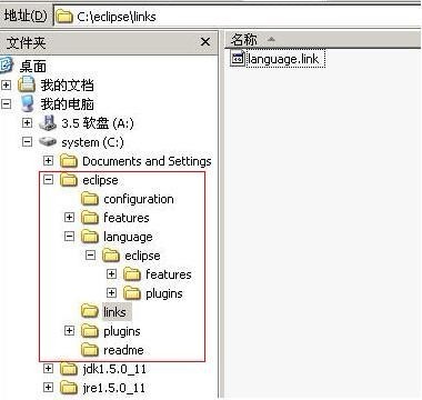 (3)建立語言包的link文件:在C:eclipse目錄下新建一個目錄并取名為links,在該目錄中新建一個文本文件并取名為language.link(擴(kuò)展名必須為.link),然后在language.link文件中加一行文字: