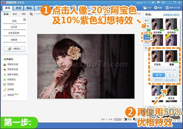 1.在“美圖秀秀”軟件下打開照片,在“美化”菜單下點(diǎn)擊“人像”分類。分別使用透明度為20%的“阿寶色”、10%“紫色幻想”以及50%“優(yōu)格”特效進(jìn)行疊加調(diào)色