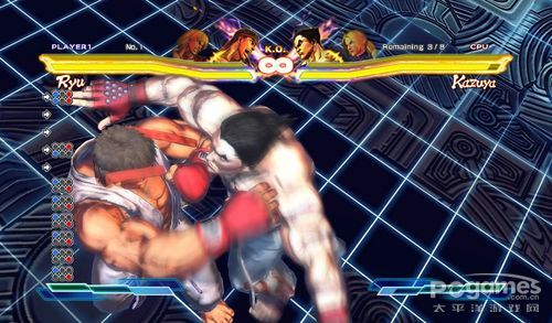 先說(shuō)人物,初期共有38個(gè),街霸和鐵拳各19個(gè)。畫(huà)面很好,特別是場(chǎng)景設(shè)計(jì)很有特色,很多場(chǎng)景里帶有彩蛋和惡作劇。音樂(lè)的話,沒(méi)街霸4好,不過(guò)有CAPCOM經(jīng)典游戲的音樂(lè),大家可以找找。