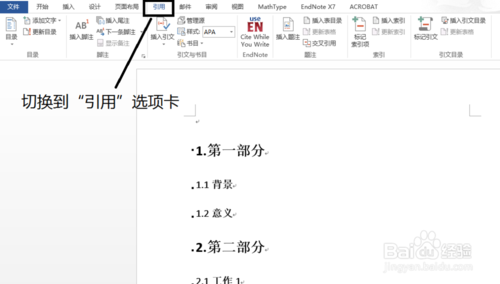 在所有標(biāo)題的樣式設(shè)置完成之后,就可以添加目錄了,將光標(biāo)定位到要添加目錄的地方,word選中“引用”選項(xiàng)卡,如下圖所示。