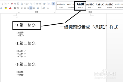 選中一級(jí)標(biāo)題,點(diǎn)擊樣式里的“標(biāo)題1”,依次將所有的一級(jí)標(biāo)題進(jìn)行設(shè)置,如下圖所示。