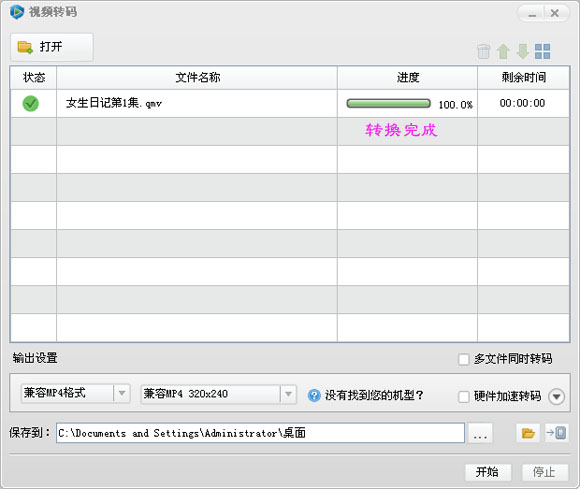 第四步:參數(shù)設置完成,點擊最下面的“開始”按鈕,文件就開始轉(zhuǎn)換了(如下圖)。【該款轉(zhuǎn)碼軟件支持輸出格式比較少,如果想要轉(zhuǎn)成日常常見的視頻格式,可以轉(zhuǎn)換其中一種格式之后,再利用其他轉(zhuǎn)換器進行轉(zhuǎn)換