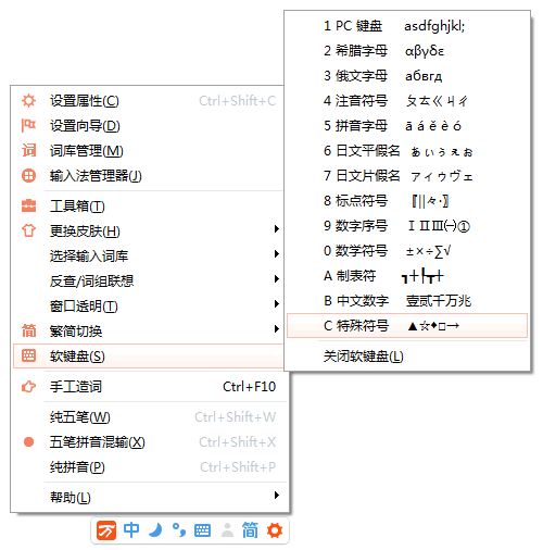 一、 鼠標點擊: 在擊功萬能五筆的功能按鈕(或輸入窗口中點右鍵)彈出功能菜單/輸入特殊符號。如下圖: