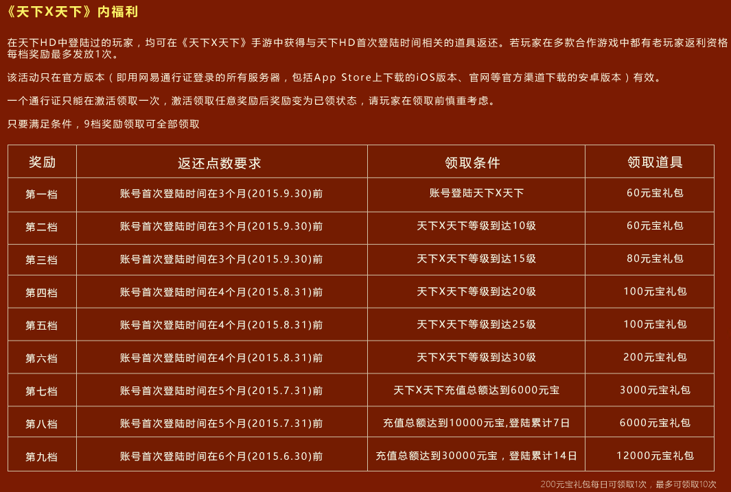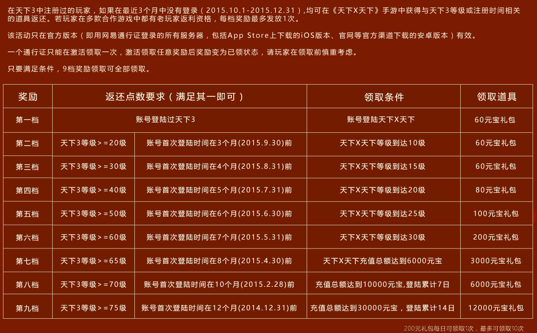為了能夠讓更多的天下3的老玩家加入到天下X天下中,官方推出了對應(yīng)的老玩家回歸禮包,只要是賬號注冊過天下3和天下HD并且達(dá)到要求就可以領(lǐng)取對應(yīng)的禮包。