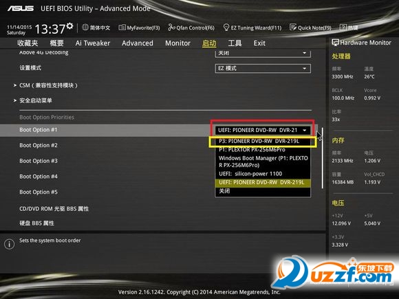 重啟系統(tǒng)進入主板BIOS設(shè)置,如果主板支持UEFI,光驅(qū)里有光盤,啟動項里會有UEFI光驅(qū)啟動項,設(shè)置第一啟動項為UEFI光驅(qū)。