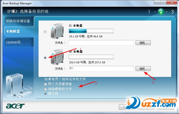 2,本地磁盤:選擇準(zhǔn)備保存到硬盤內(nèi)的位置(1),點(diǎn)擊瀏覽(2)選擇保存路徑(和保存到可移動存儲設(shè)備是選擇同樣的選擇方法),選擇同名文件處理方法(3,默認(rèn)選擇是"提示我")