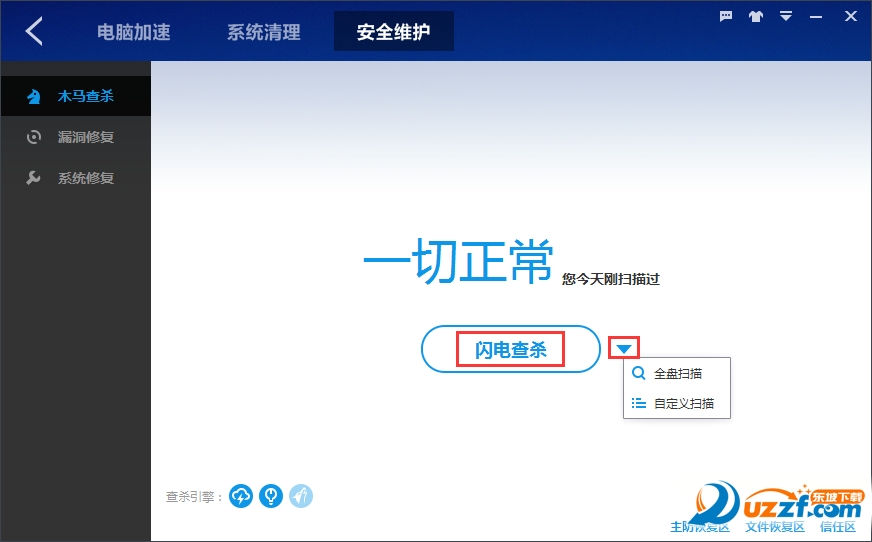 百度衛(wèi)士軟件有“閃電查殺”、“全盤查殺”、“自定義查殺”三種病毒查殺模式,您可以選擇您需要的模式進行病毒查殺。