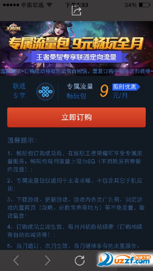 在點券購買界面,點擊“流量包”按鈕后喚起訂購頁面,然后點擊“立即訂購”按鈕,按照指示進行操作。王者榮耀專屬流量包價格為9元/月。