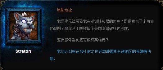 最近這段時間一直有玩家在問暗黑破壞神3亞服的英雄榜何時上線的問題,目前有位東南亞地區(qū)的玩家詢問暴雪他們什么時候能使用英雄榜功能,對于這一問題,暴雪技術(shù)部的Straton是這樣回答的: