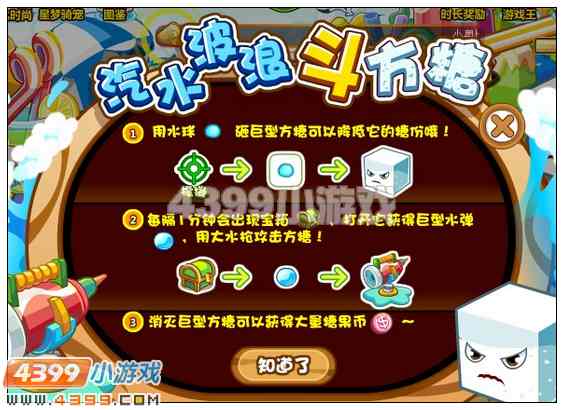 小奧比們用水球砸巨型方糖可以降低它的糖分,用大水槍攻擊巨型方糖的速度這樣就可以更快的打敗它哦。
