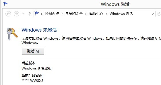 進(jìn)入Windows 8 的激活窗口,可以通過控制面板進(jìn)入(控制面板\系統(tǒng)和安全\操作中心\Windows 激活),也可通過桌面右下角的“小旗子”直接進(jìn)入?煽吹较聢D: