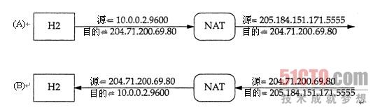 假設(shè)主機(jī)H2要向204.71.200.69,www.yahoo.com的Web服務(wù)器之一,發(fā)送一個(gè)TCP SYN段,以便打開(kāi)一個(gè)連接。在圖2-13A中可以看到這個(gè)段離開(kāi)H2時(shí)目的地址為204.71.200.69.80,源地址為10.0.0.2.9600。