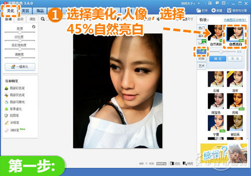 1、啟動“美圖秀秀”先打開待處理的照片,進入“美化”菜單中點擊“人像”分類,選擇透明度為45%的“自然亮白”,點擊“確定”先初步提高人物面部亮度。