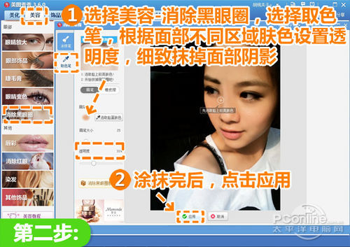 2、進入“美容”菜單下點擊“消除黑眼圈”功能,選擇“取色筆”選項,根據(jù)人物面部不同區(qū)域的膚色設(shè)置透明度,對人物面部上的陰影進行細致的涂抹。涂抹完畢后,點擊應(yīng)用。