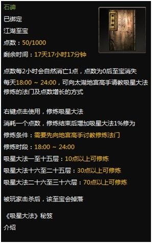 江湖絕學(xué)葵花寶典和吸心大法的修煉方式有別于其它武學(xué),學(xué)會相關(guān)武學(xué)后,需要通過【江湖至寶】才可進(jìn)行修煉。而這【江湖至寶】就是被擊殺即可能掉落的道具。