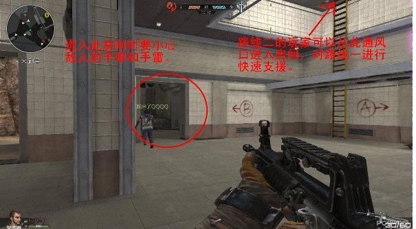 路線三:從庭院進攻,大概走到下圖的位置就會與守衛(wèi)者發(fā)生交火,如果能順利突破,那么左手邊便是通往A點的大門。另外,圖中紅圈處小房間旁邊有一個小門,進去后是通往地下的隧道,這條隧道通往B點,途中會經(jīng)過與B點相鄰的一個房間。B點與其相鄰房間之間有通風(fēng)道連接,這個通風(fēng)道除了可以在兩個房間之間來回移動外,還有兩個安全梯,安全梯通往A點兩個通風(fēng)口的出口。